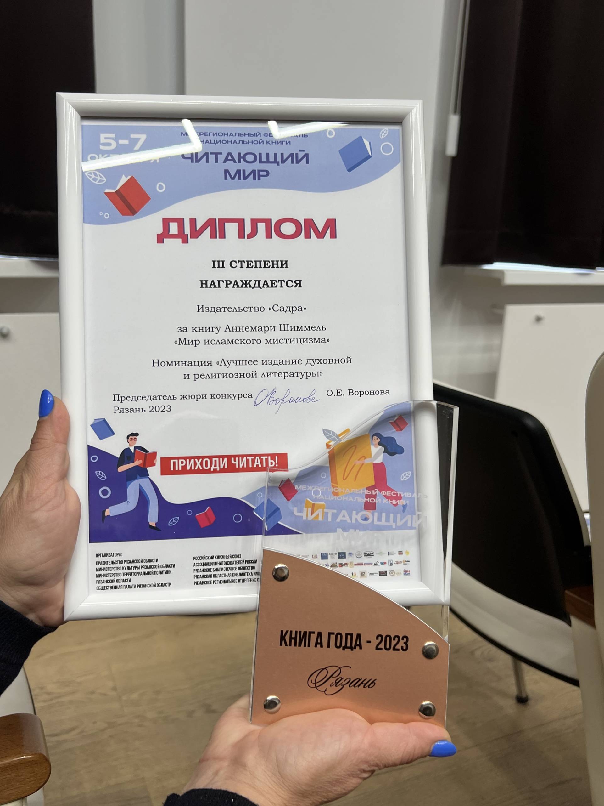 Работа нашего издательства была отмечена Дипломом III степени за книгу Аннемари Шиммель “Мир исламского мистицизма” в номинации “Лучшее издание духовной и религиозной литературы”.