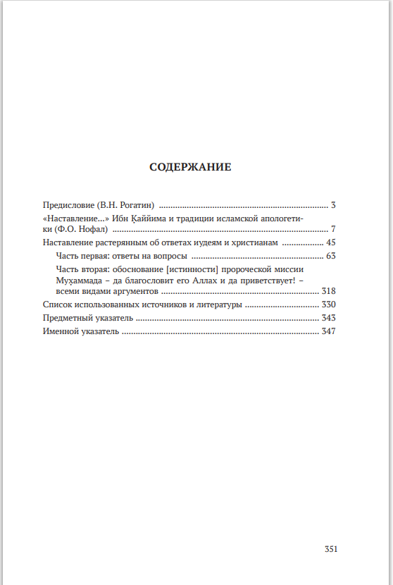 «Наставление растерянным об ответах иудеям и христианам» – программный апологетический труд Ибн Каййима ал-Джавзиййа (1292–1350), подводящийитог семи векам исламо-христианского и исламо-иудейского диалога. Впервые публикуемый в русском переводе, трактат Ибн Каййима снабжен вводным исследованием, критическим комментарием, по-новому обозревающим источники и аргументацию суннитского богослова, а также указателями, призванными помочь читателю в работе с текстом.